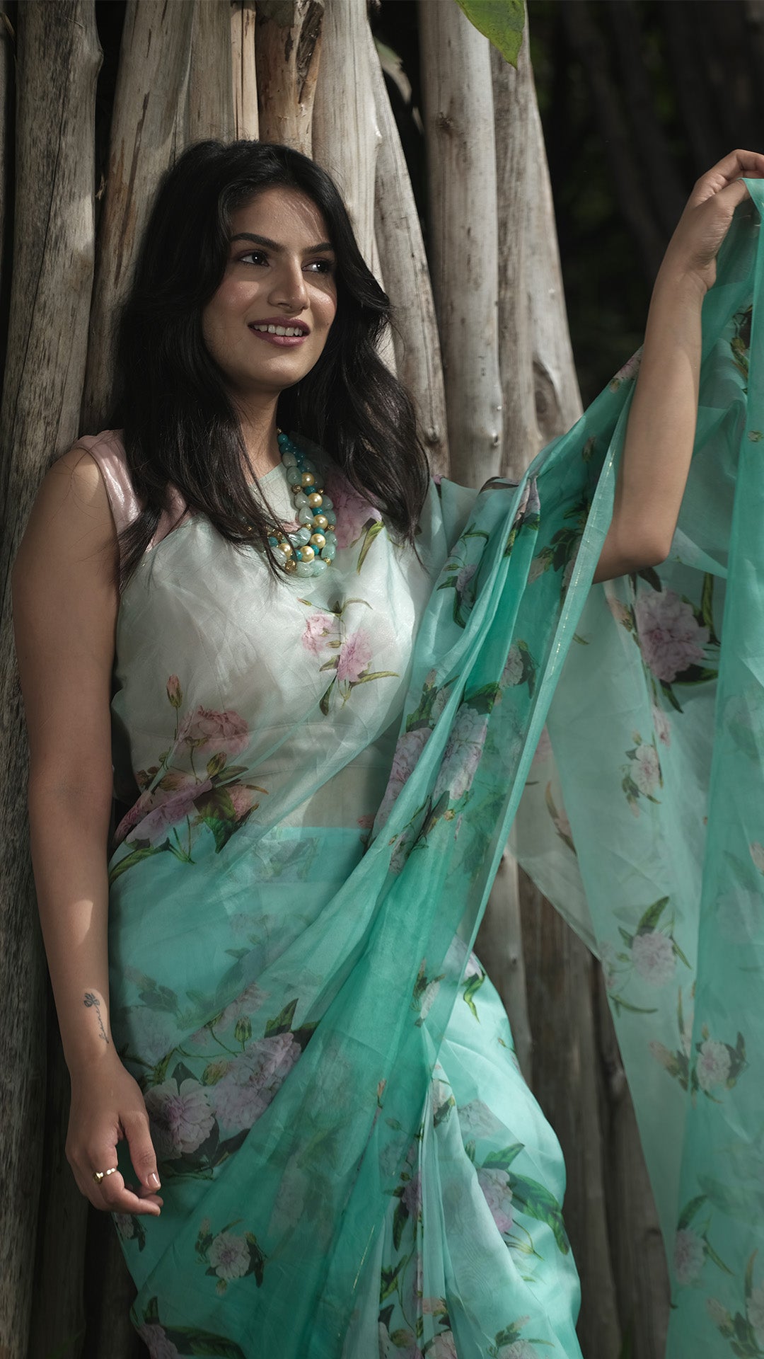 In a radiant orange hue, the saree embodies the warmth of the desert sun and the pulse of fearless energy. The leopard print, woven in a play of hide and seek with floral motifs, tells a story of contrasts — of power meeting beauty, of the wild meeting the refined.