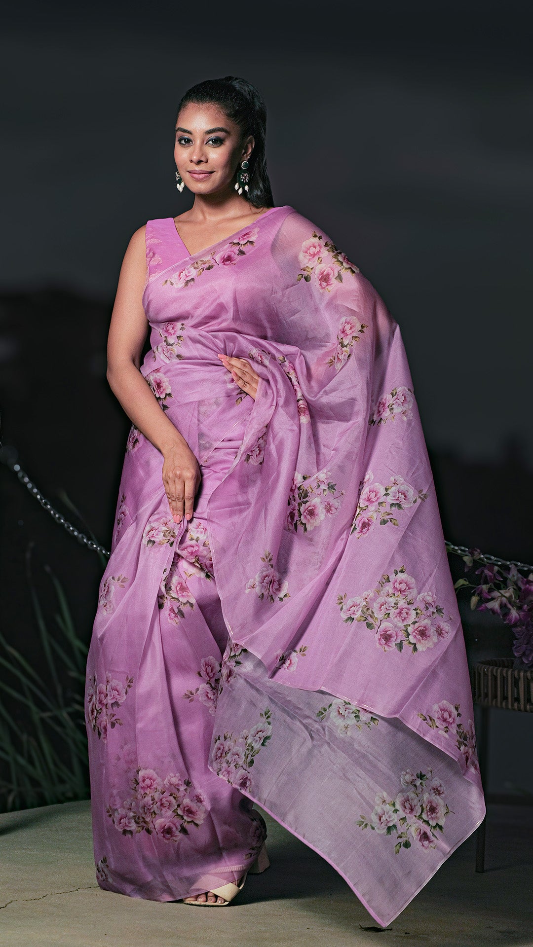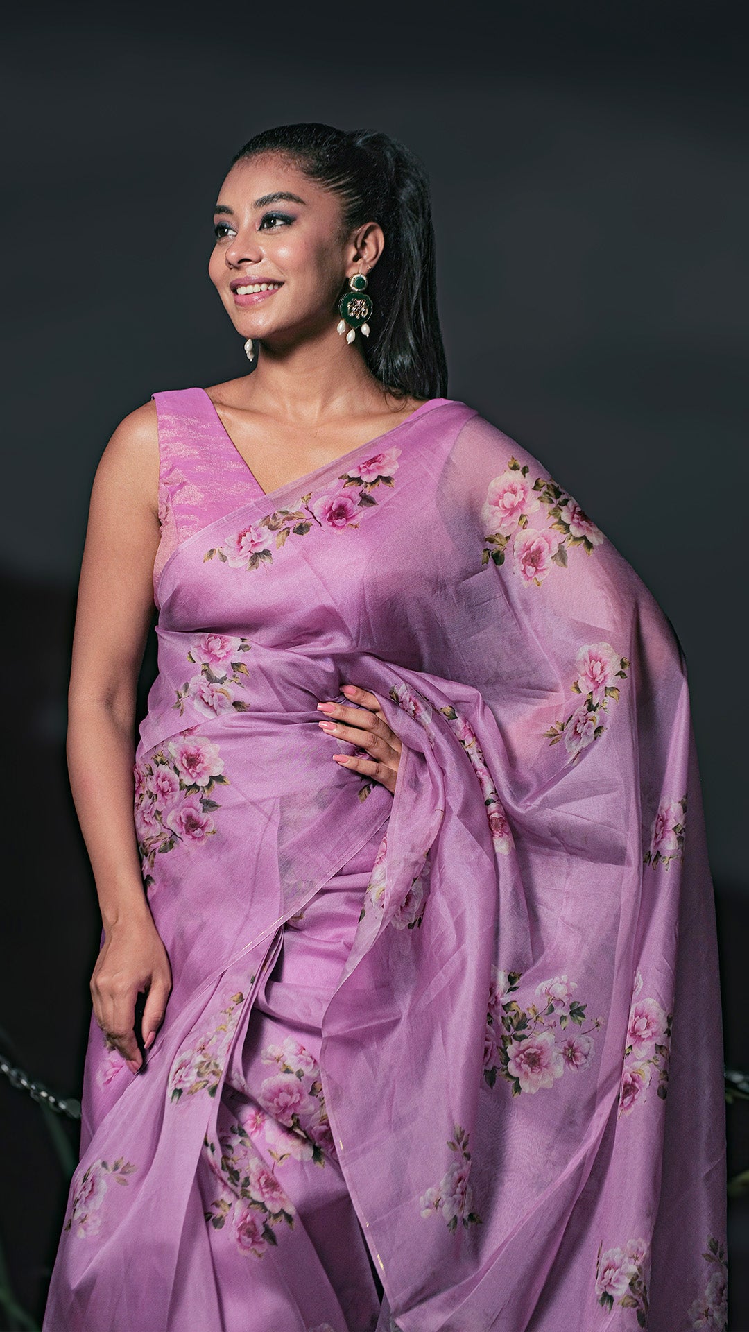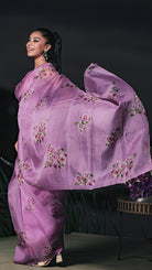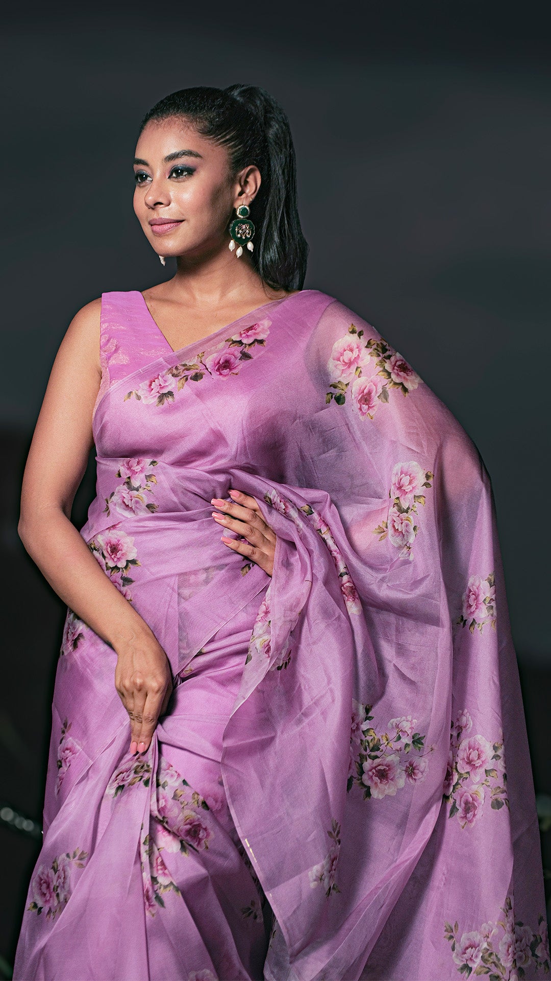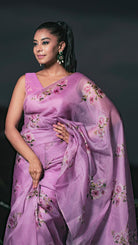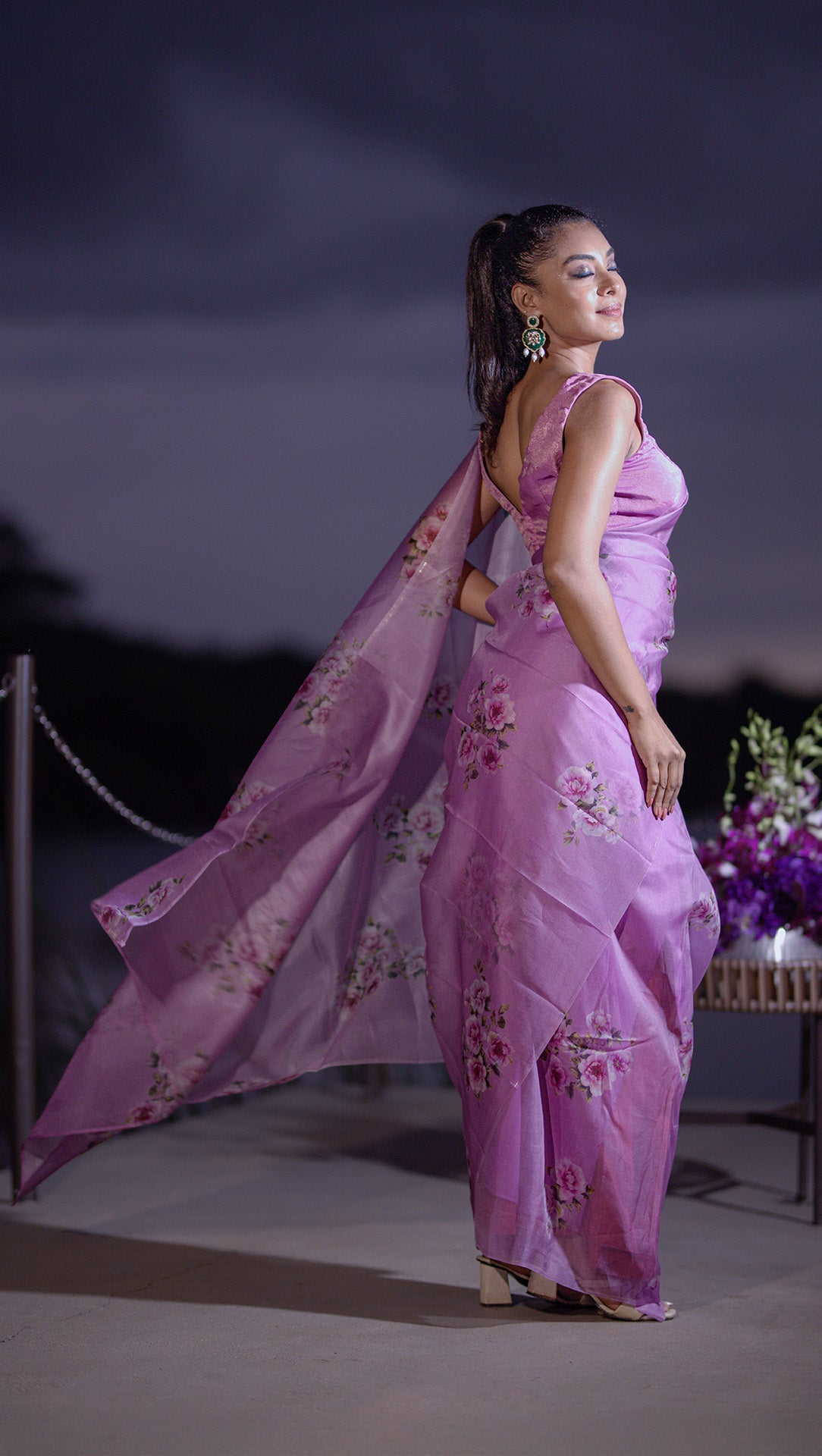 In a radiant orange hue, the saree embodies the warmth of the desert sun and the pulse of fearless energy. The leopard print, woven in a play of hide and seek with floral motifs, tells a story of contrasts — of power meeting beauty, of the wild meeting the refined.