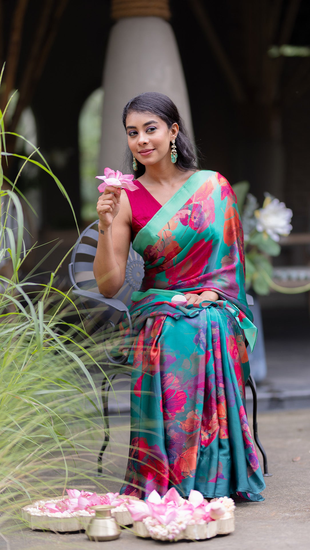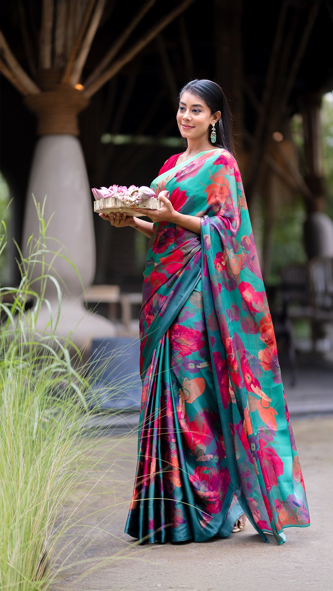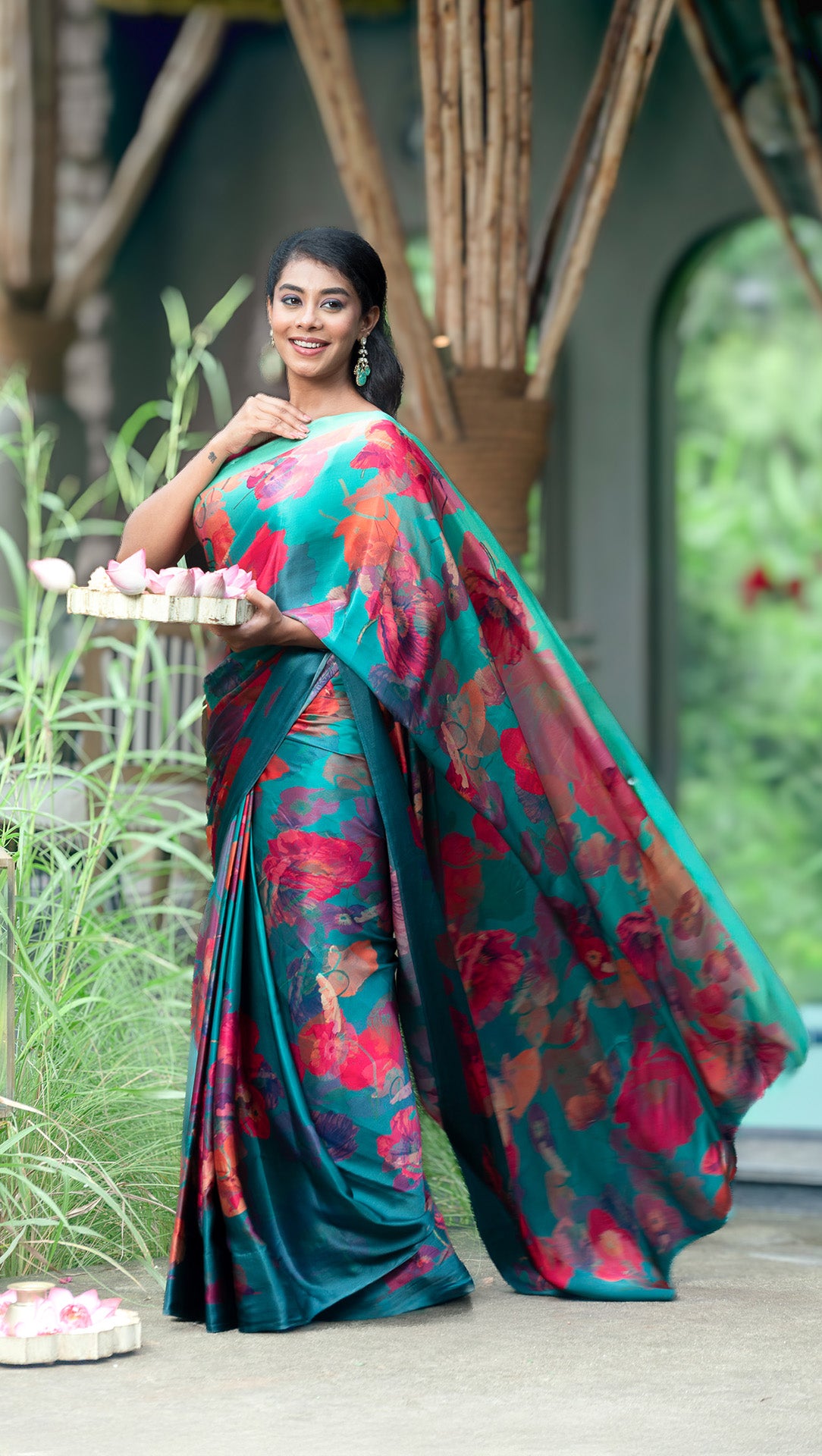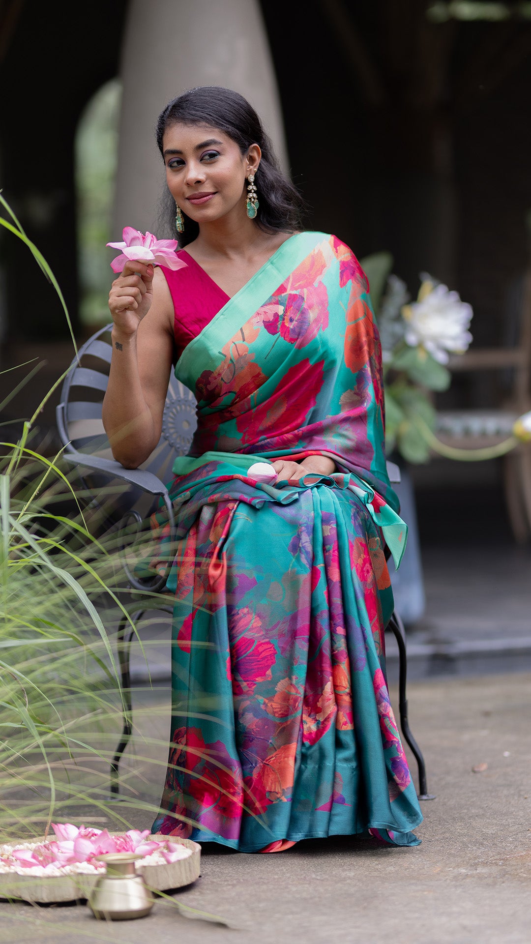 Ombre Green and Teal Bloom – Pure Silk Satin Saree