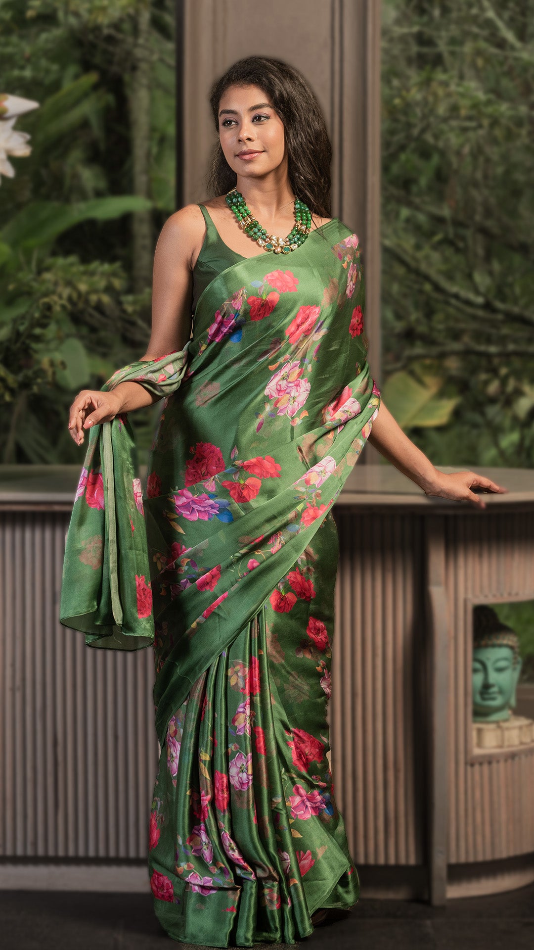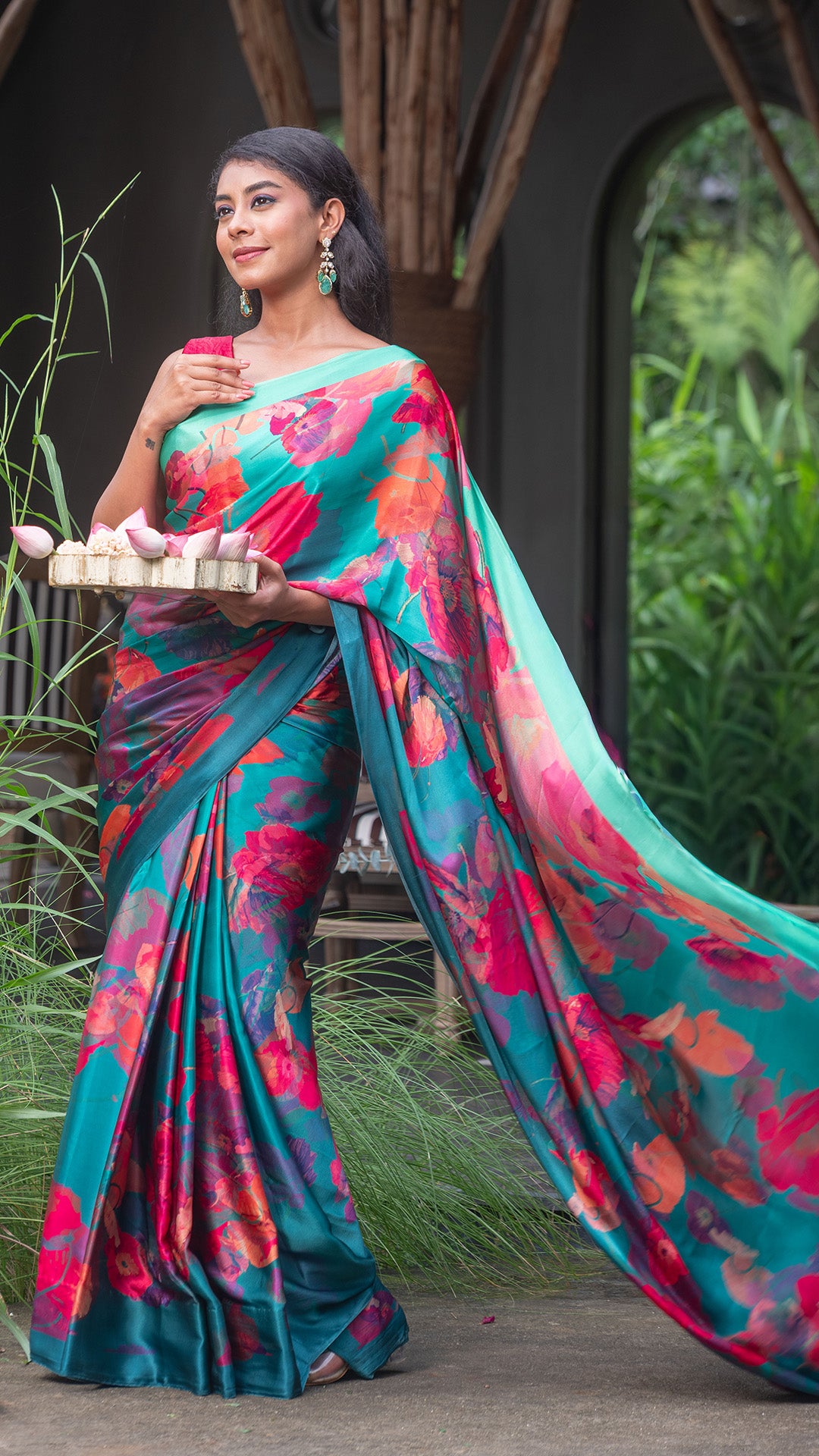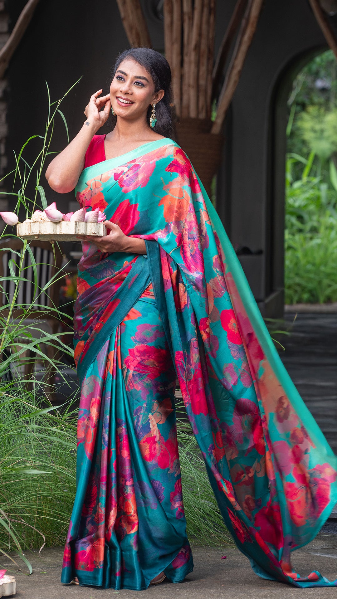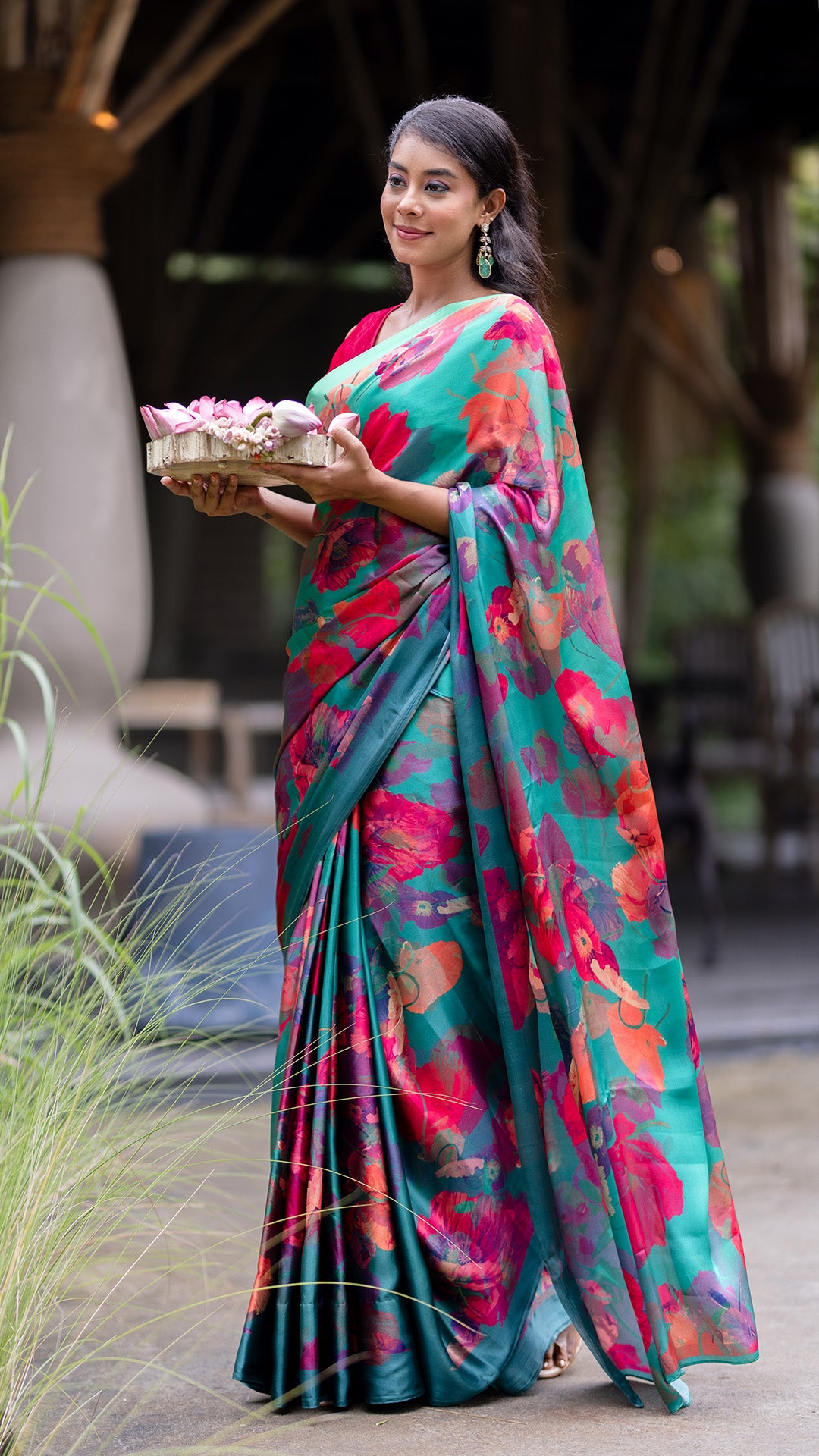 Ombre Green and Teal Bloom – Pure Silk Satin Saree