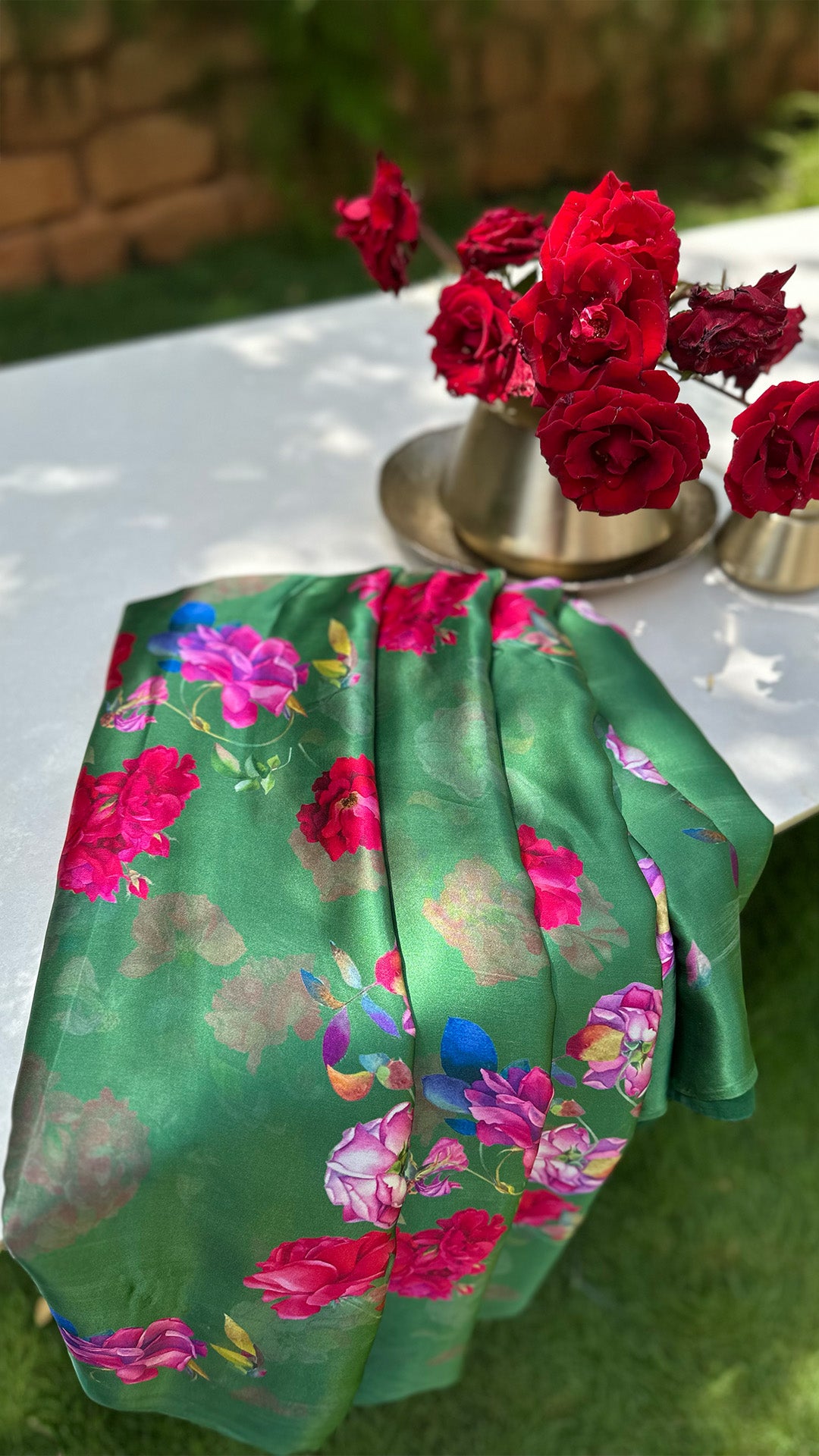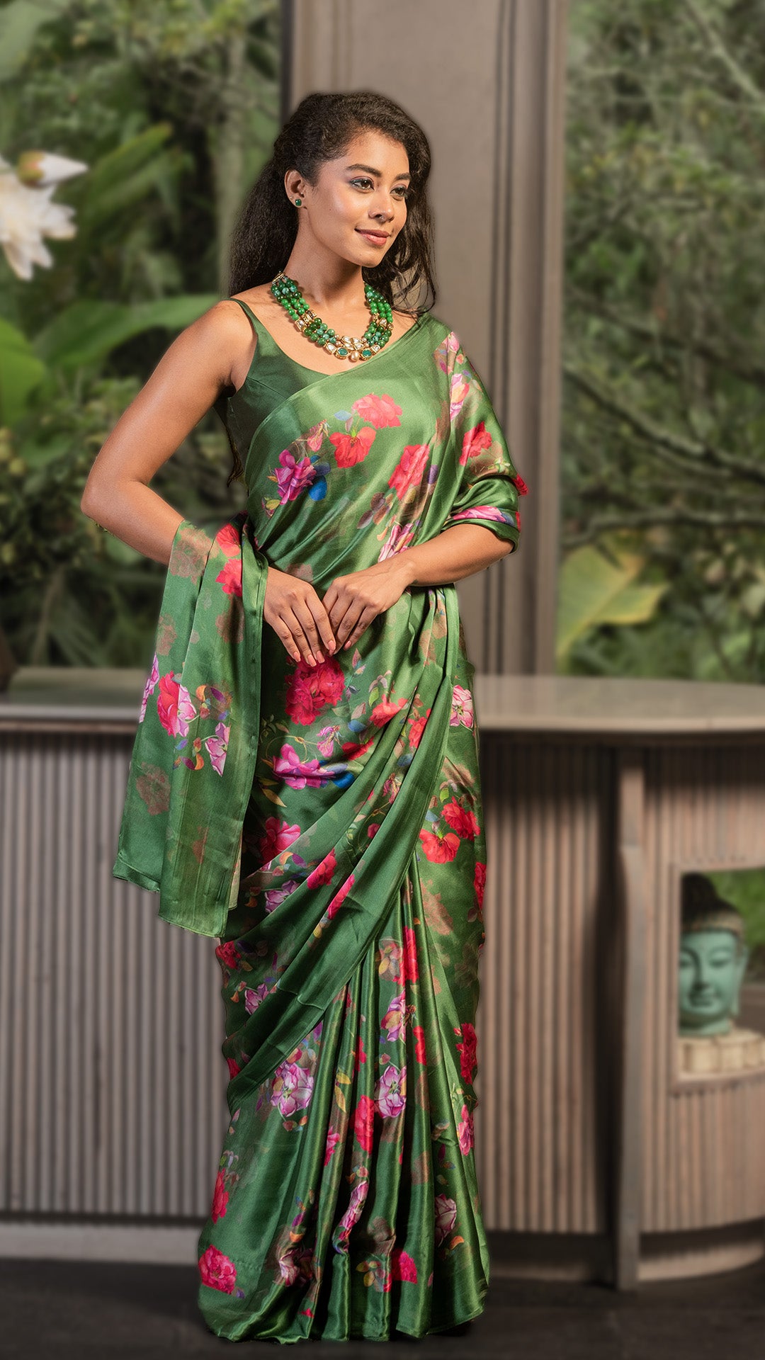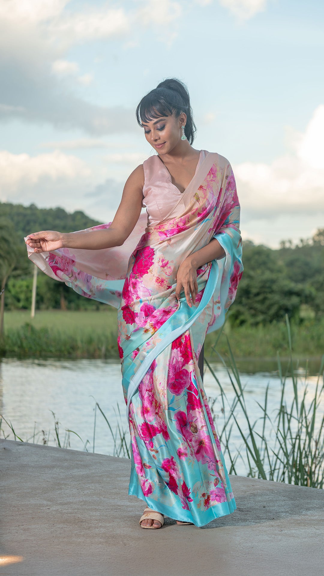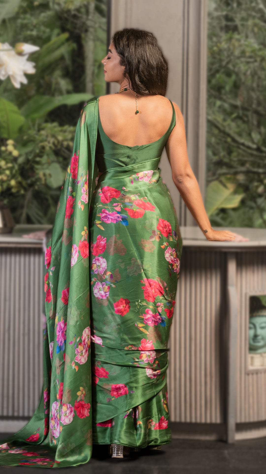 Ombre Green and Teal Bloom – Pure Silk Satin Saree