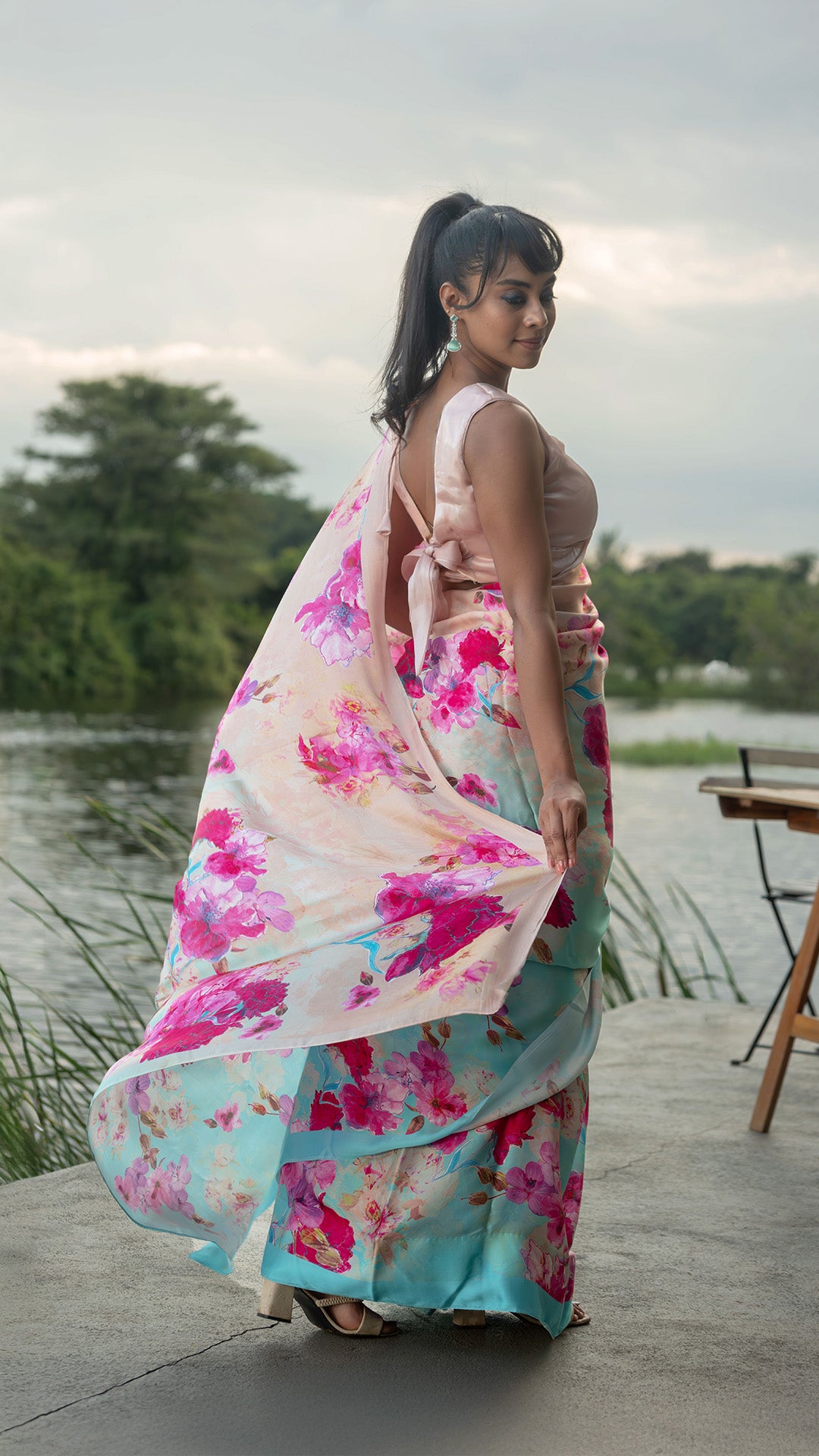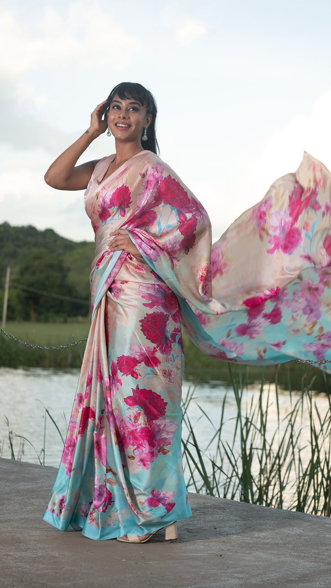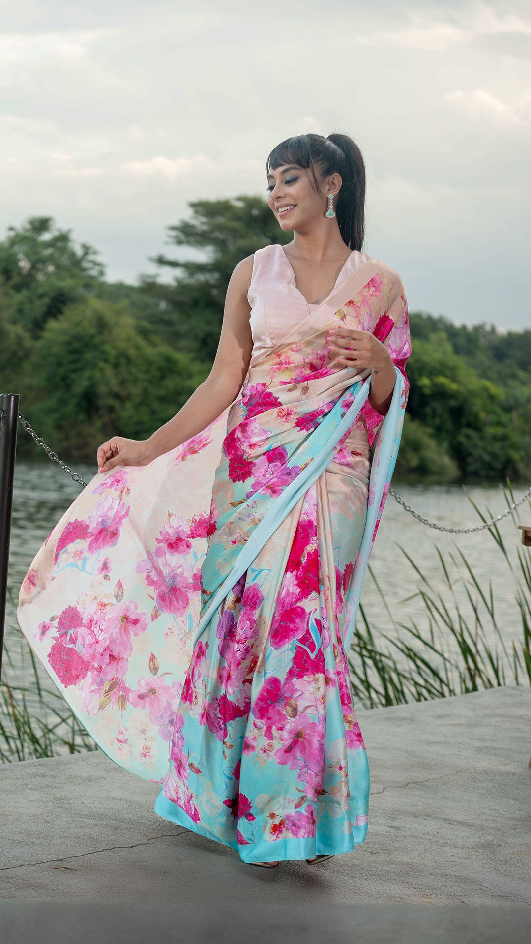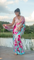 Teal & Peach Dreamscape – Pure Silk Satin Saree