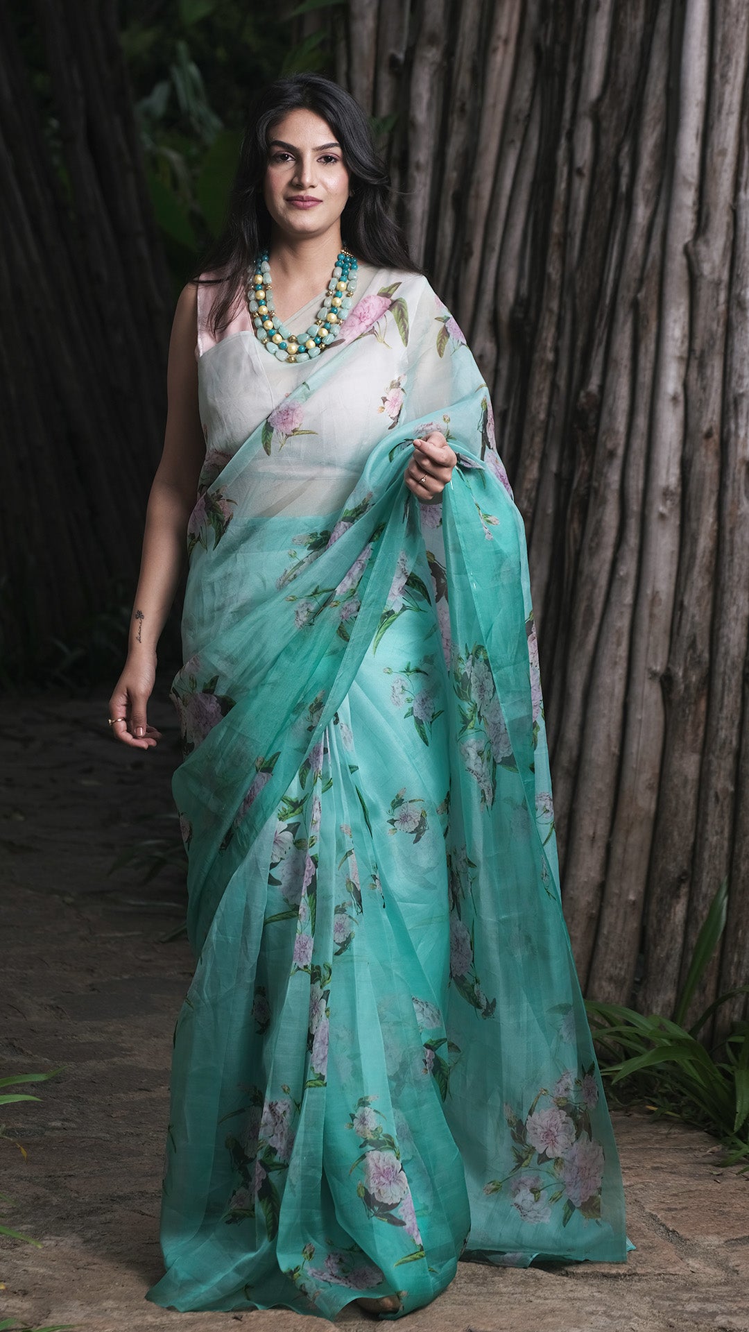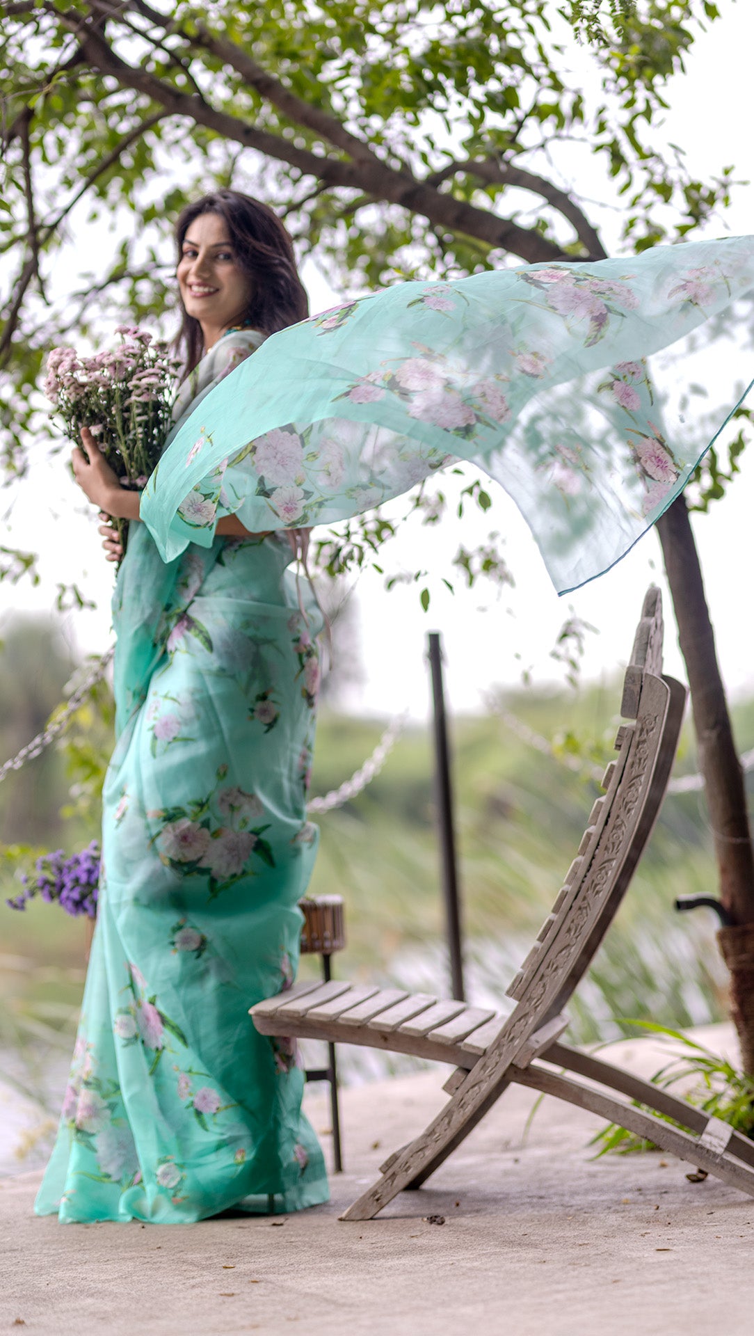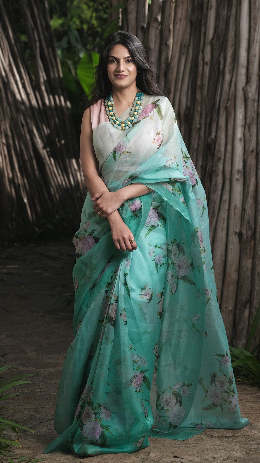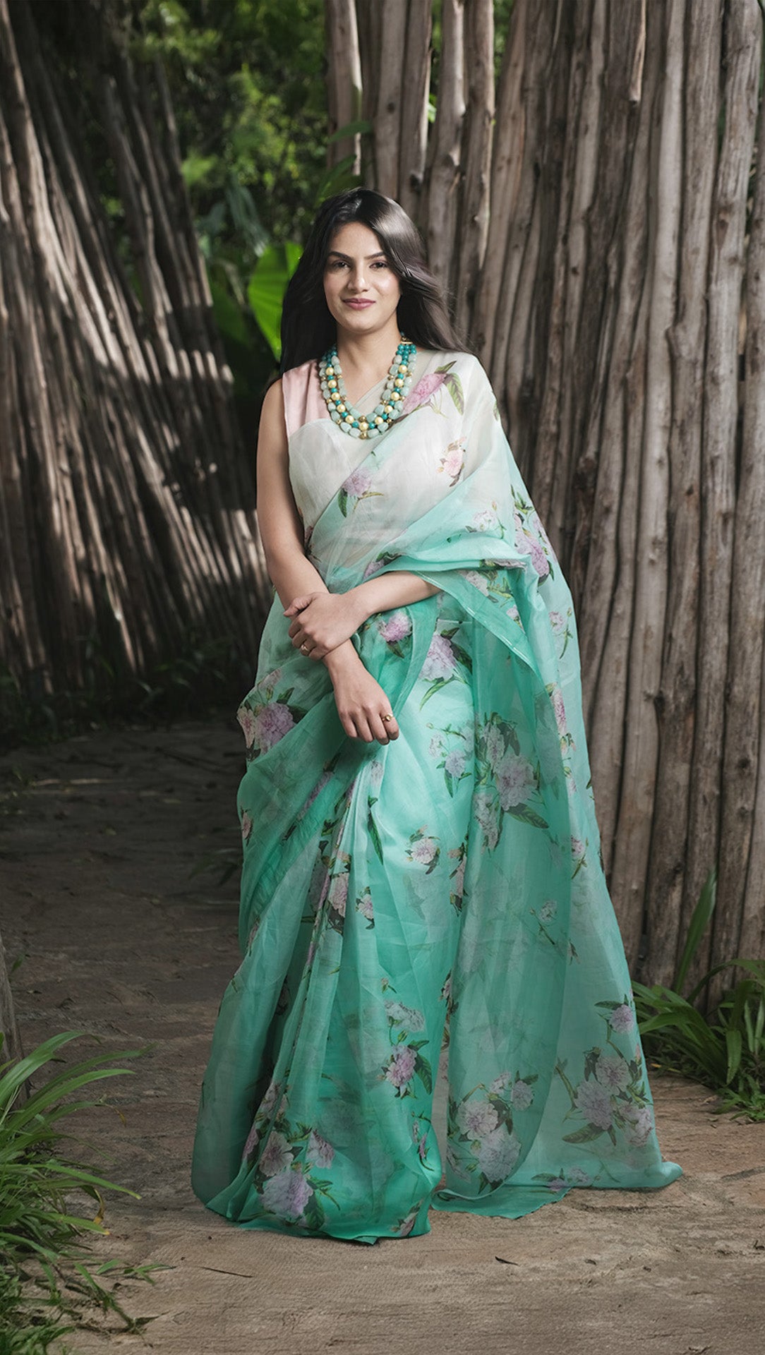 In a radiant orange hue, the saree embodies the warmth of the desert sun and the pulse of fearless energy. The leopard print, woven in a play of hide and seek with floral motifs, tells a story of contrasts — of power meeting beauty, of the wild meeting the refined.