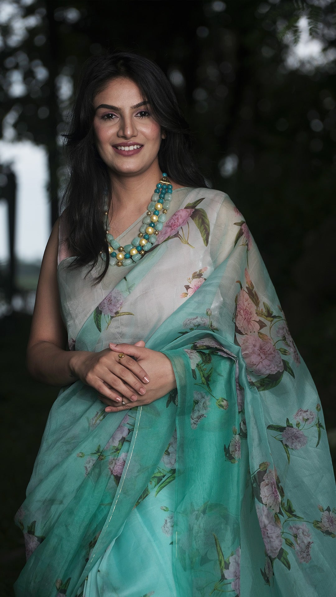 A pure silk creation, this saree is a canvas of confidence. It celebrates the Amalika woman — powerful yet playful, poised yet untamed. Draped in this, she doesn’t just wear fashion — she claims her territory.