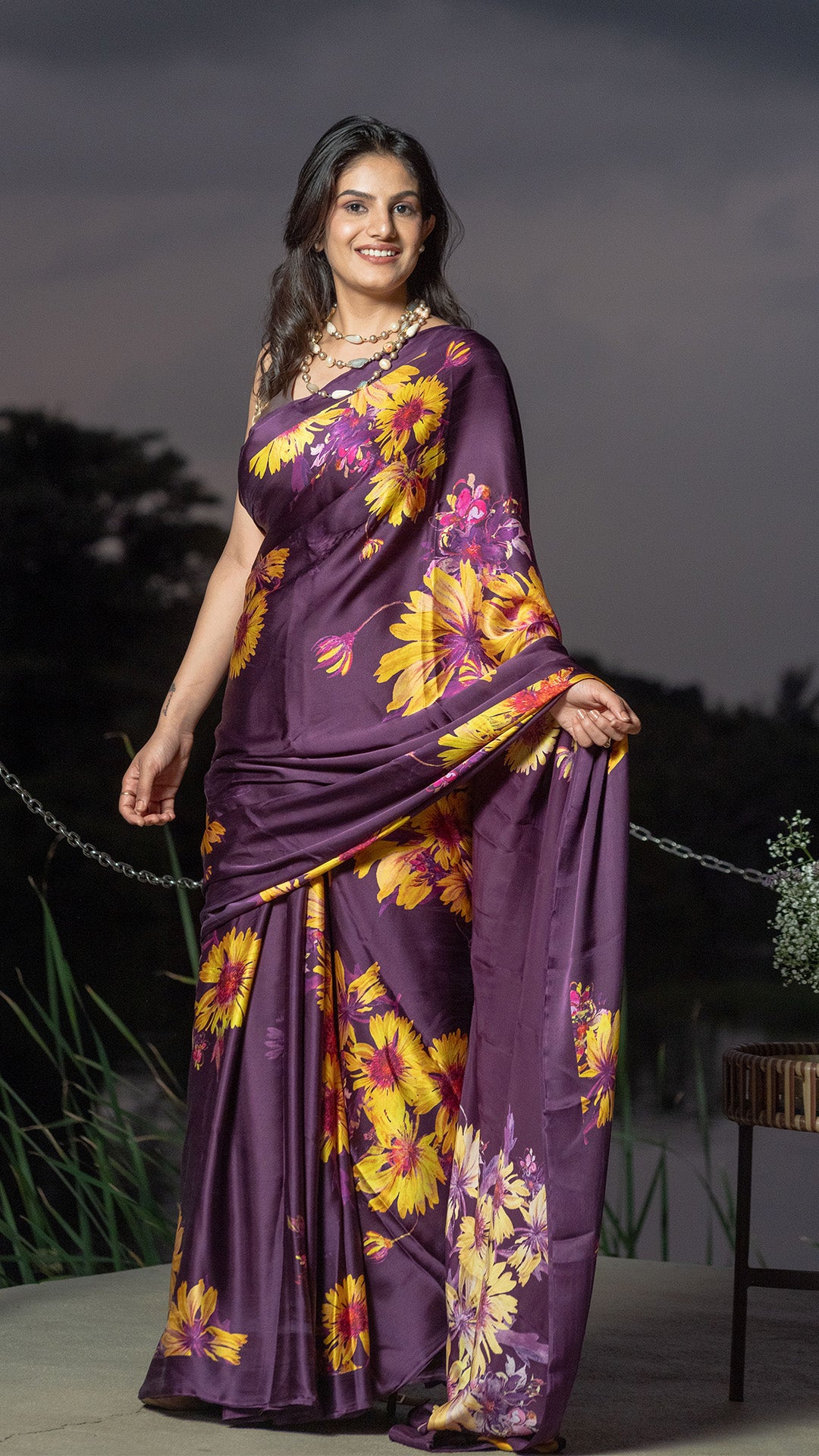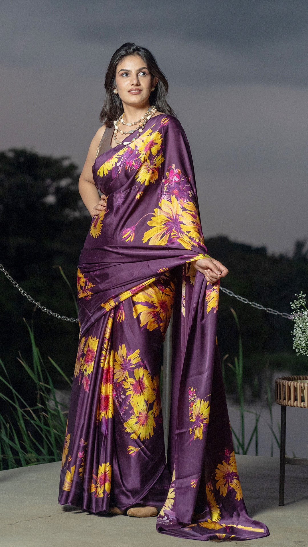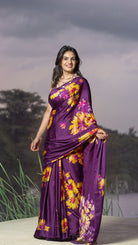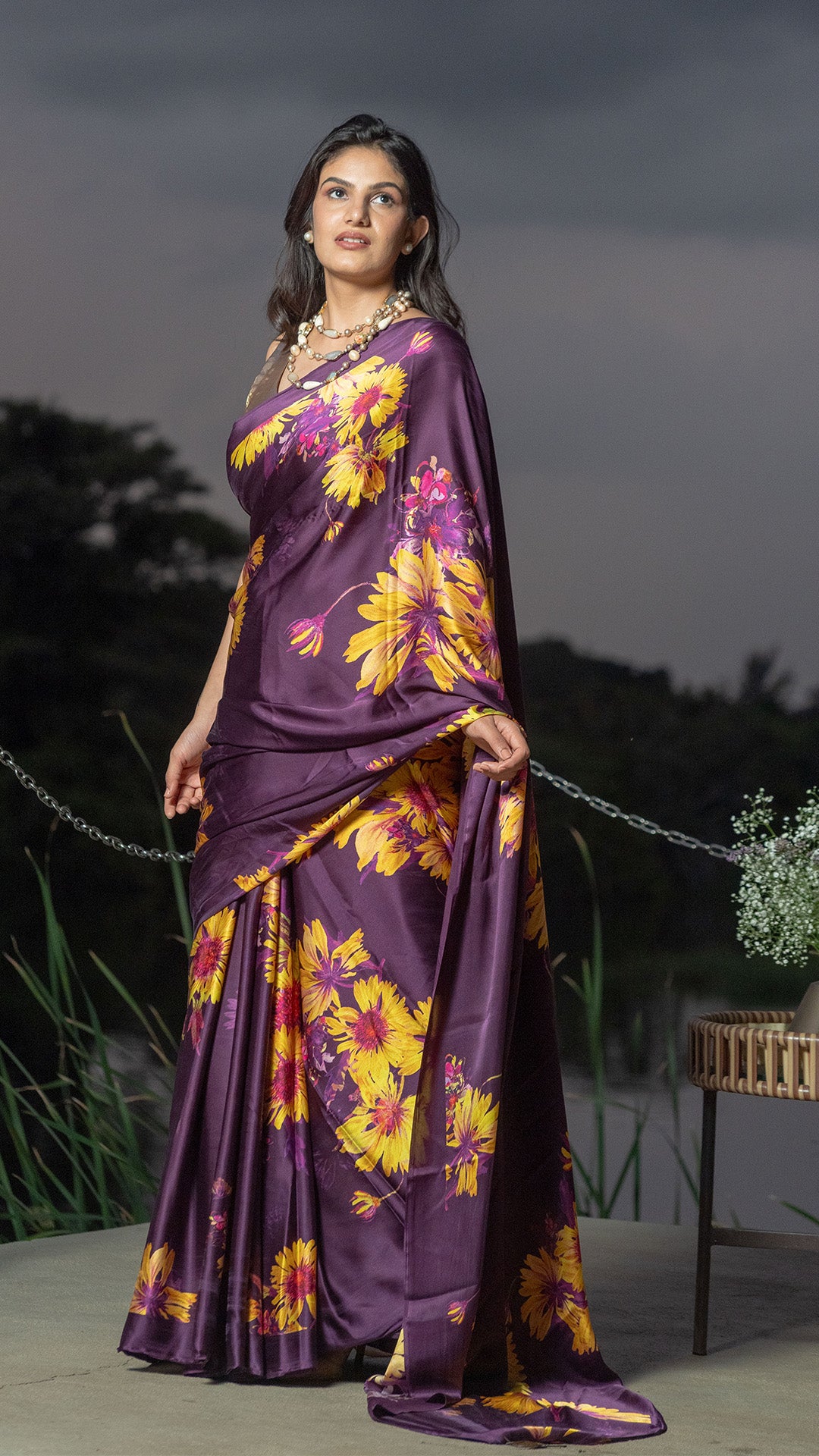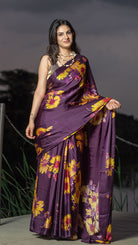 The Twilight Bloom – Deep Purple Silk Saree with Sunflowers
